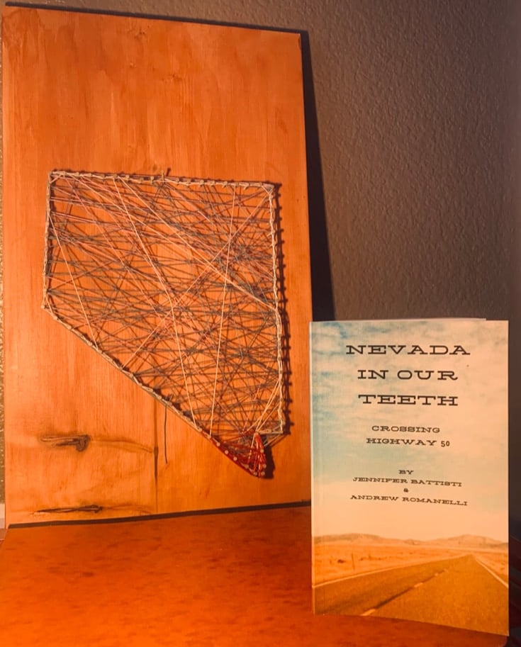 A collaboration between Jennifer Battisti & Andrew Romanelli, Nevada in Our Teeth Crossing Highway 50 contains 17 poems in a travel ready size of 4.25X6.86 with 56 pages, 5 of them being lined so you can write down your own thoughts and explorations.